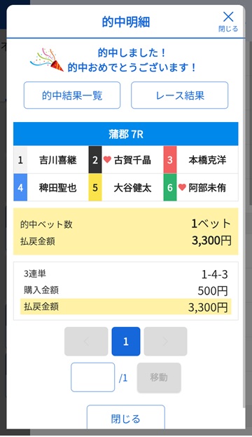 123はオッズが下がると思って2枚入れといて正解でしたね。とりあえず1000円が1820円に。