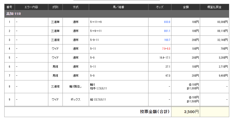 馬連3-9、ワイド3-9、3連複3-9-11をそれぞれ300円ずつ。3連単3→9→11を100円で