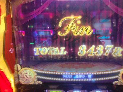 追加2000円でATに入る。そしてこれが伸びる。久しぶりに3回戦も突破し「運命の一劇」もクリア(途中も引いて最終Gも子役を引いてた)